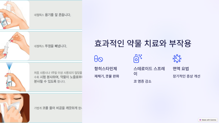 항히스타민제만으로 조절이 안 될 때는 비강 스테로이드 스프레이를 사용합니다. 처음에는 스테로이드라는 단어에 거부감이 있었지만, 국소적으로 사용하는 것이라 전신 부작용이 적다는 의사의 설명을 듣고 사용해봤습니다.