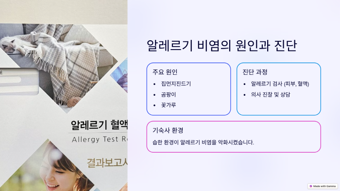 A: 효과적인 관리를 위해서는 원인 물질을 아는 것이 중요합니다. 피부단자검사나 혈액검사를 통해 알레르기 원인을 확인하면 환경 관리에 큰 도움이 됩니다. 저는 검사를 통해 집먼지진드기와 곰팡이가 주 원인임을 알게 되었습니다.