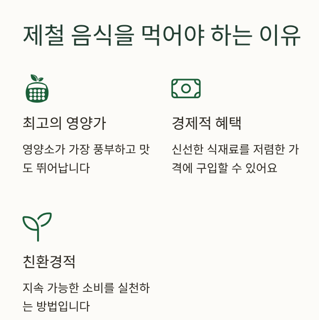 이렇게 제철 식재료를 활용한 식단을 구성하면 영양소도 골고루 섭취하고 식사의 질도 높일 수 있어요. 건강한 식습관은 하루아침에 만들어지지 않지만, 조금씩 개선해 나가면 분명 변화가 있을 거예요.