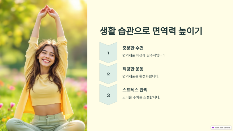 이러한 방법들을 종합적으로 실천하면 면역력 향상에 도움이 될 수 있지만, 가장 효과적인 방법은 평소부터 꾸준히 건강한 생활습관을 유지하는 것임을 기억하세요.